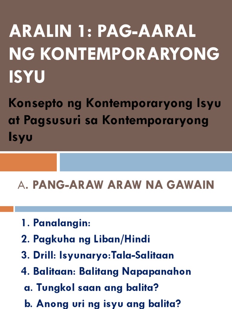 Mahalaga at makabuluhan sa lipuan ang ginagalawan 2. Para sa iba pang pagpapaliwanag kung ano ang isang kontemporaryong isyu. May malinaw na epekto sa lipunan o sa mga mamamayan 3.