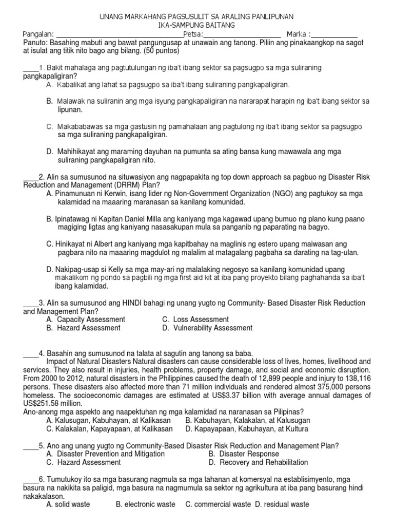 Periodical test sa araling panlipunan 10 kontemporaryong isyu 1st grading. Test For Araling Panlipunan Grade 2. Araling Panlipunan Grade 10 Unang Markahan Mga Isyung Pangkapaligiran at Pang-Ekonomiya Topics under this module Ang Pag-aaral ng mga Kontemporaryong Isyu Ibat Ibang Uri ng Kalamidad sa Komunidad at Bansa. Flores at Melanie D.