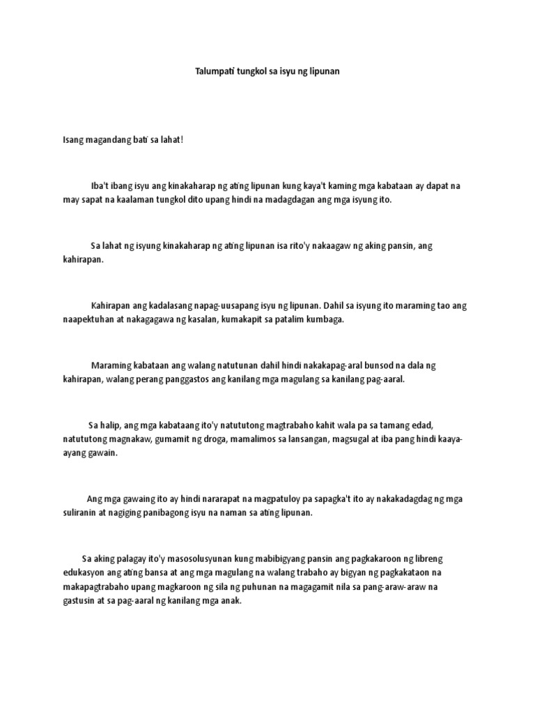 Talumpati ukol sa mga isyu. Ay isang akademikong sulatin na naglalahad ng mga matitibay katwiran ukol sa pinapanigang isyu. Ang kahirapan ang pinakamalaking kinakaharap na problema sa ating bansaBakit ngaba marami ang mga taong mahihirap o naghihirap at nagdurusa dahil dito. Isa pang dahilan kung bakit patuloy na naghihirap ang Pilipinas ay ang katamaran ng mga tao dapat marunong tayong maging masipag mag tiyaga at dumiskarte kung papaano maiaangat ang sarili natin sa kahirapan.