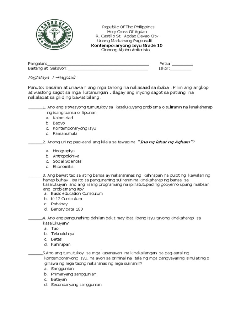 TALISAYAN NATIONAL HIGH SCHOOL San Jose Talisayan Misamis Oriental Buwanang Pagsusulit Araling Panlipunan 10 Unang Markahan Pangalan_____. Kahalagahan ng Pag-aaral ng mga Kontemporaryong Isyu Pinakamahalagang Kasanayang Pampagkatuto Nasusuri ang kahalagahan ng pag-aaral ng kontemporaryong isyu. Home PRE-TEST PRE-TEST FIRST GRADING PERIOD RESOURCES FOURTH GRADING PERIOD Teacher Tips GGB ONLINE Untitled Teacher Tips.