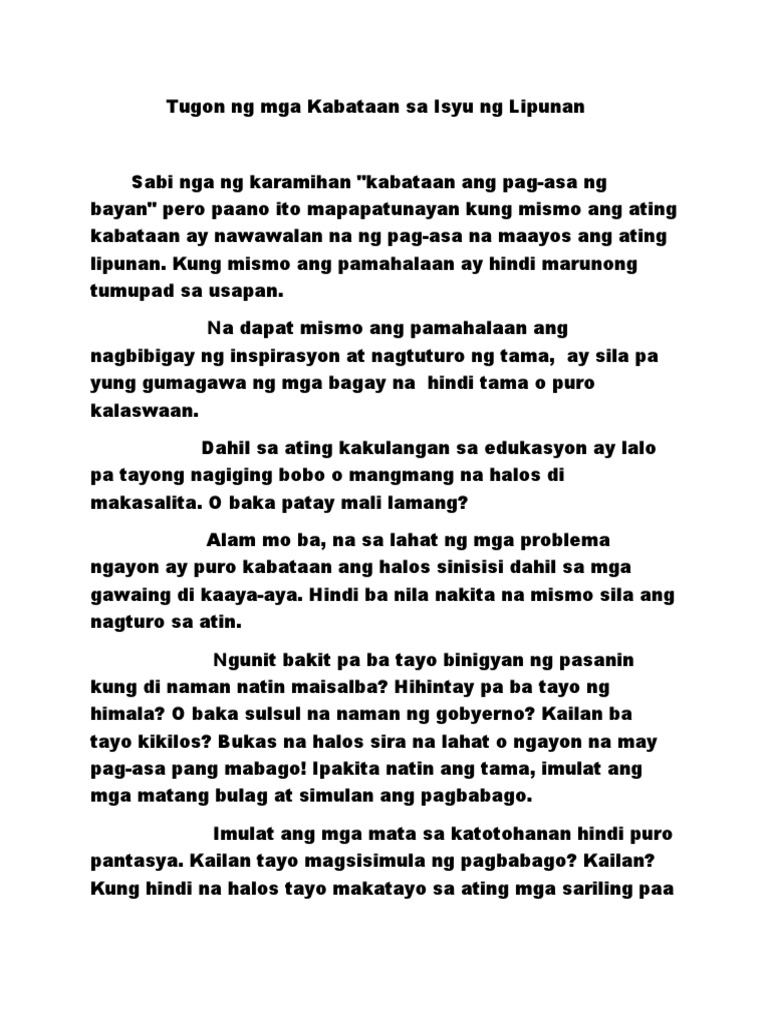 Magandang umaga mga kapawa mag-aaral mga kabataan magandang umaga. Tugon ng mga Kabataan sa mga Isyu ng Lipunan Talumpati. Edukasyon edukasyon ang pangunahing problema ng lipunan sapagkat hindi natuturuan ng ayos ang mga kabataan kung ano ba ang tama at mali.